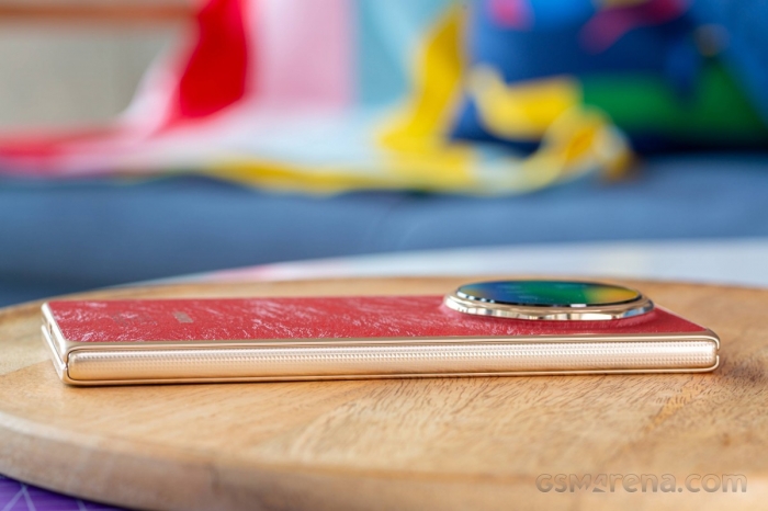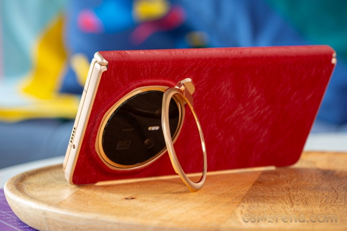 Ốp lưng đi kèm có bề mặt mô phỏng lớp hoàn thiện dạng da lộn ở mặt sau máy. Cảm giác cầm thực tế không hoàn toàn giống da thật, nhưng hiệu ứng đổi màu theo góc nhìn khá bắt mắt. Đáng chú ý, phần ốp còn tích hợp chân đế xung quanh cụm camera, tiện lợi khi xem video hoặc họp online.