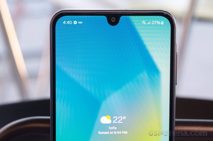 Mặt trước của máy cũng được phủ kính và có viền khả mỏng tạo nên không gian hiển thị rộng rãi. Camera trước đặt trong đường cắt chữ U không quá lớn gây khó chịu.